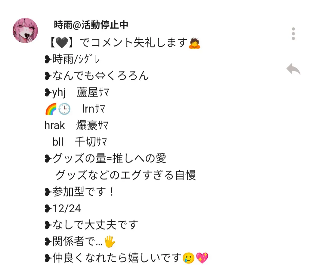 🐦⬛↪雑談 🔪↪病み 🐈⬛↪リレー 🎧️↪お知らせ 👑↪相談 🌻↪宣伝 📸↪実写(スポラ) (順番関係✘)BIGLOVE 🌻🎧️🧡↪お嫁ちゃん 🫧🐣🎧️↪精神安定剤 🔴🧹🎮️↪旦那さん 🤍🐾👼↪最愛 🍡🌀⛓️↪姐さん *🥀💍↪妹ちゃん 🩷🍓🌸↪幼馴染 🍑🍯💕↪妹ちゃん 💛⚡️💫↪娘ちゃん 🎀🩷🎀↪相棒ちゃん 🌻🫧💛↪お師匠様 ⚫️💫💜↪お姉ちゃん 🐻🍀🔔↪お姉ちゃん 🌙🍀🎶↪お姉ちゃん 📚️🎼💜↪お姉ちゃん 🎵🌸💛↪大親友ちゃん 🎵🎧️🐈️↪娘ちゃん 🍼🍭💫↪娘ちゃん 🍪🫧🍼↪お姉ちゃん 🍰🕊️↪お姉ちゃん 😈🥀🔫↪ご主人様 🎀🎹↪大親友ちゃん 🗝️🎐↪大親友ちゃん ⚖️🕯️↪大親友ちゃん 🐚🐬🌸↪お母さん 🎀🐰💫🌙↪大親友ちゃん