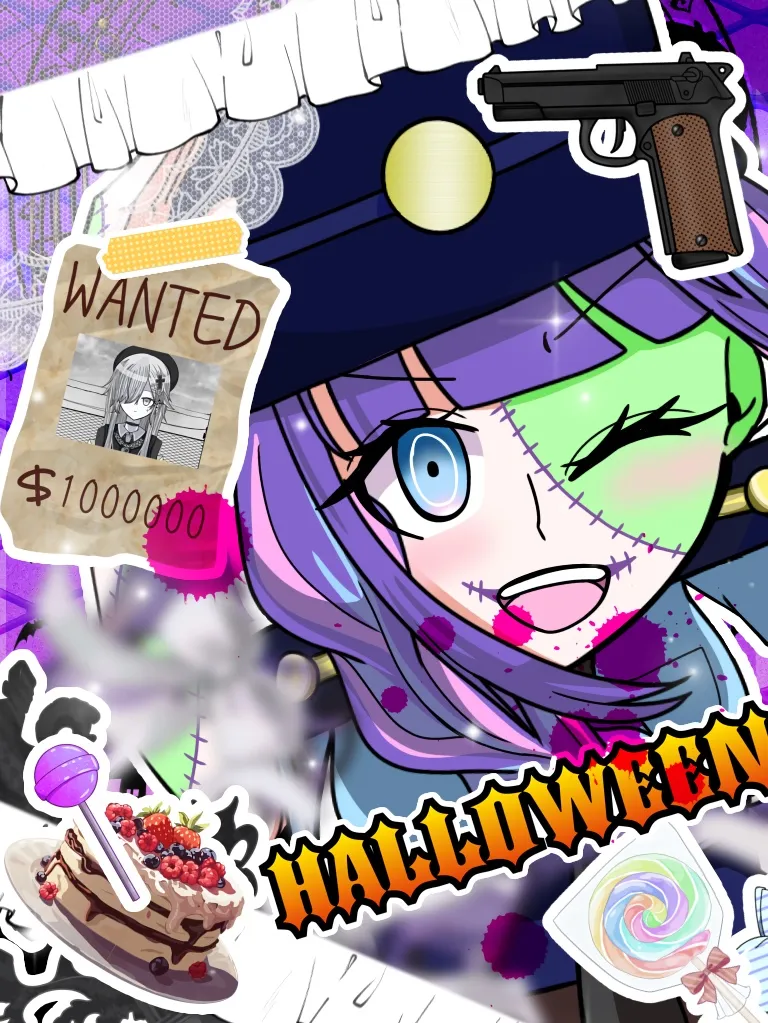 梨愛ちゃん、最初描き終えてなんか足りないな〜って思ってたらゾンビ要素がすっかり抜けてて急いで修正した。後指名手配のポスターは自作