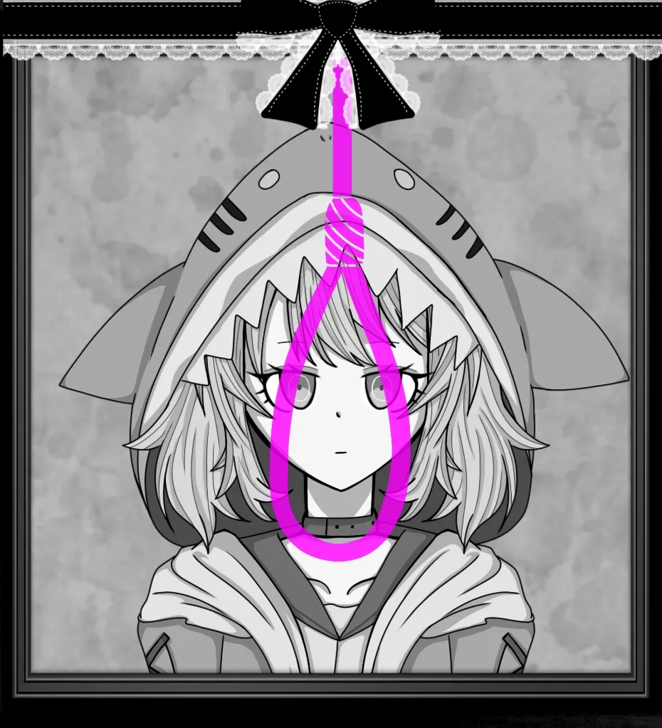 六花ちゃんの遺影、六花ちゃんは裏切り者、裏切り者と言えばキリスト教のユダから影響を受けこのスタイルに。ちなみにキリスト教のユダはキリストを裏切った自責の念から最後は首を吊って死んだらしいです。