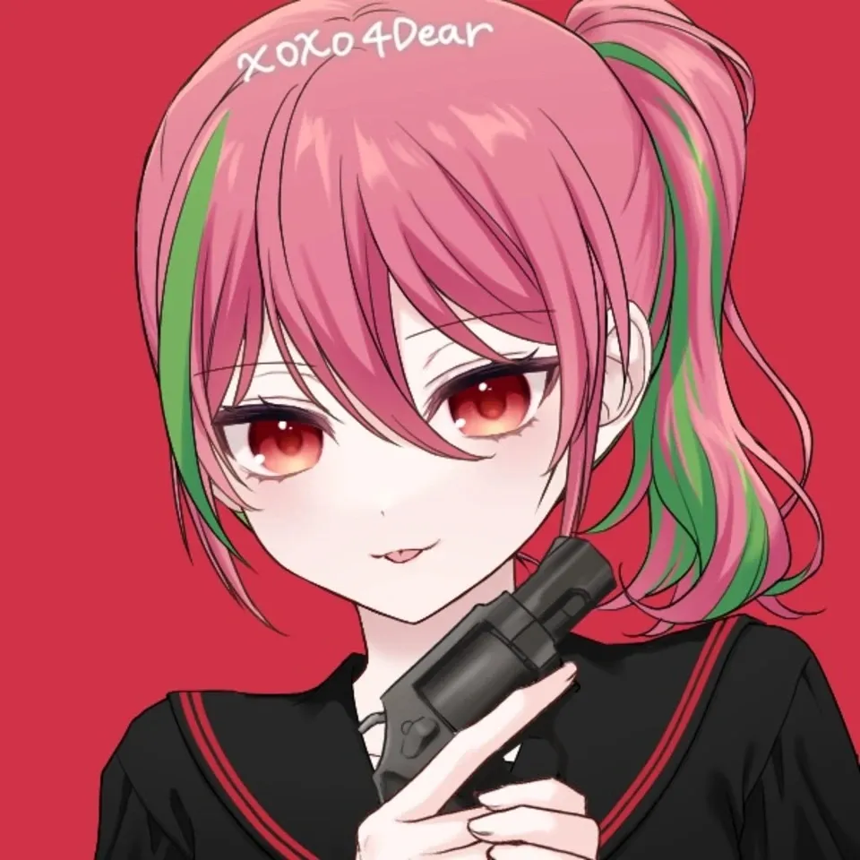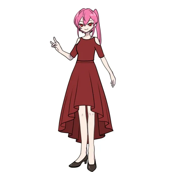 ・右で薄緑~紅の髪をあげていて、花のような軽そうな血色の服を着ている。