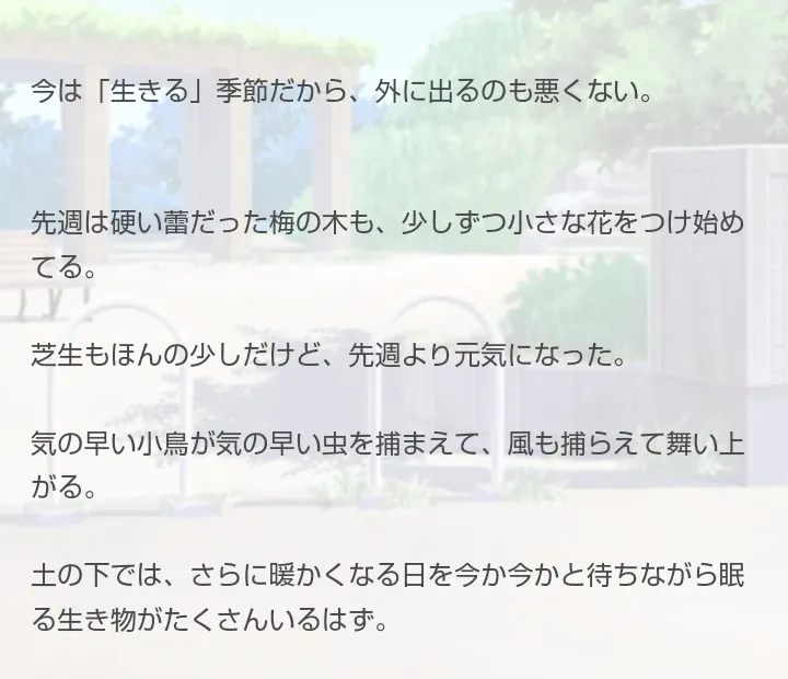 「生きる季節」「梅の花」「芝生」「小鳥」「暖かくなる日を待ちながら」……。