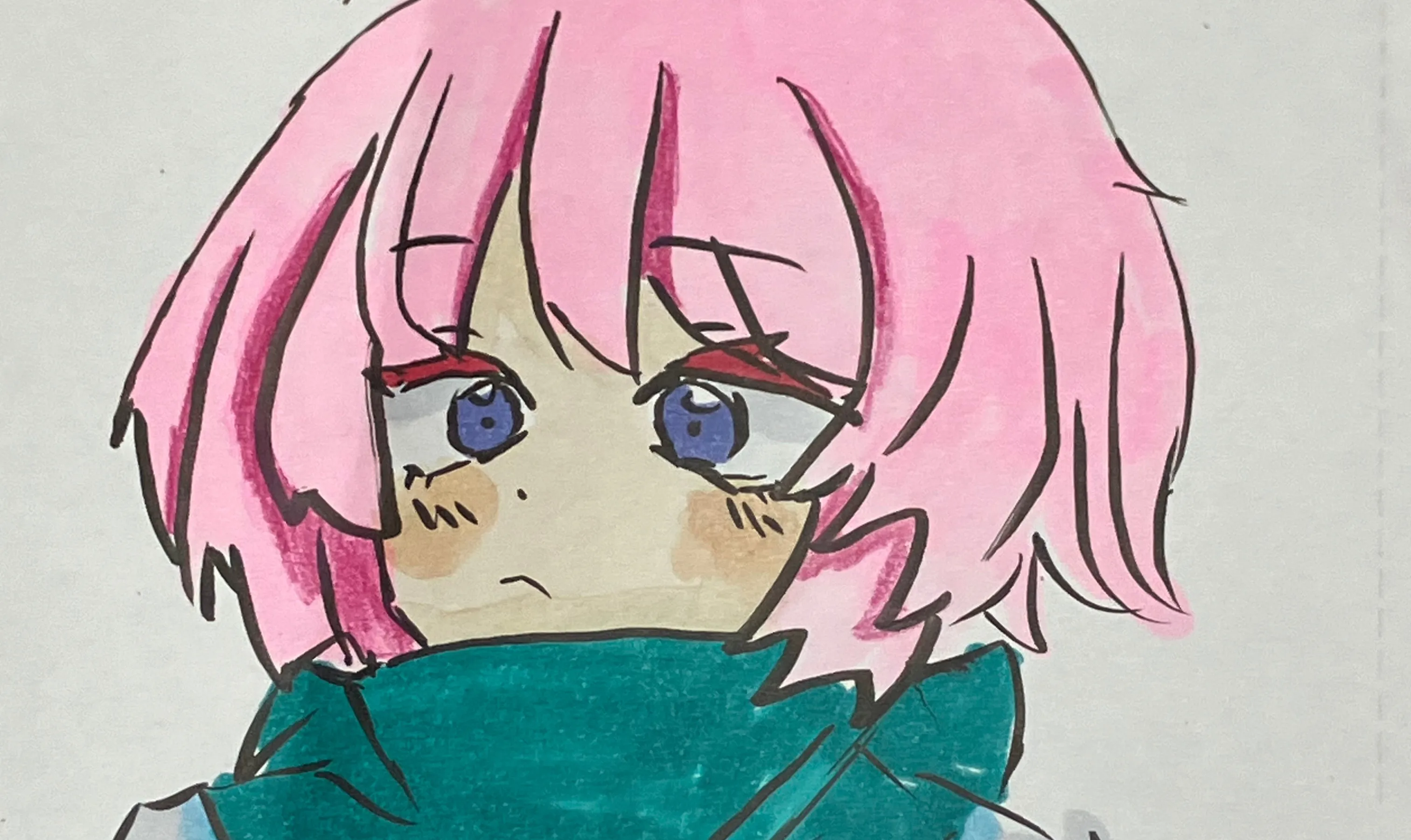 髪色は鴾色と言い、明るい紫みの赤。