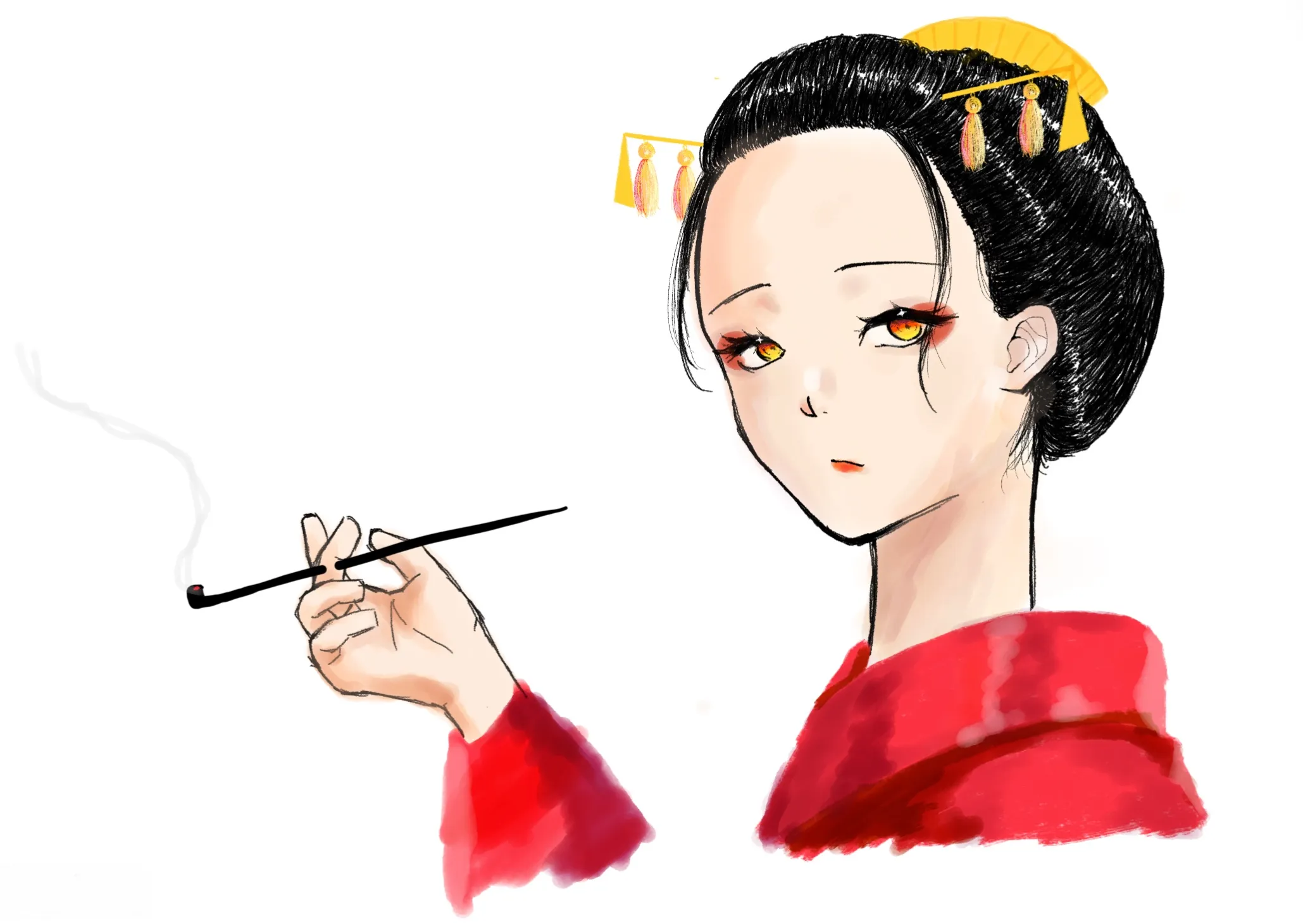 先に顔のとこだけ肌の色置いて、その上に線画を描くって適当に描いてたら花魁が似合う顔してたから花魁にした