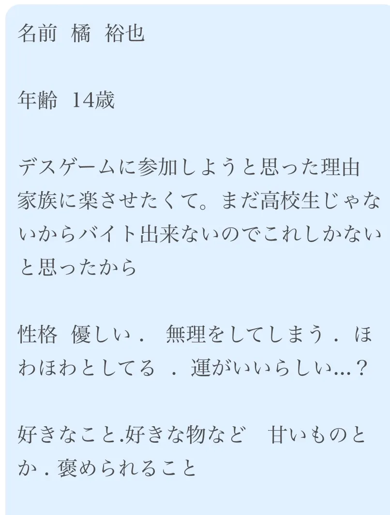 どういうタイプのデスゲームか分かんなかったけど個人戦的なのならやりづらい設定にしちゃってごめんね🙇♂️