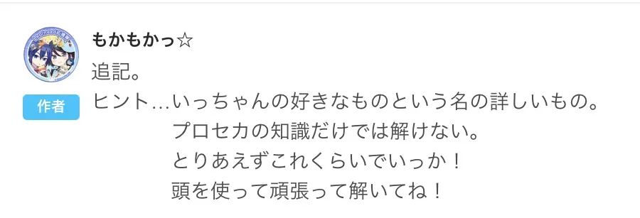 まず、頭を使って考える。つまり問題の頭を使うってことです。そうすると、「ちぐりじあ」わざわざひらがなで書いたのには意味があります。いっちゃんの好きという名の詳しいもの。プロセカの知識はここでほんの少しだけ役に立つ。つまり花についてです→ちぐりじあは花の名前です。そして花言葉を見る…そうすると答えが出ますね。裏の花言葉の1つ意味は…私を助けてです。さて、これはこの後のストーリーにどう響きますかね?ちなみに勘のいい人はこの小説に隠されてるもう一つの小ネタ?に気づくんじゃないでしょうか。この小ネタはまだ完成はしてませんが。それについても次回で解説していこうかなと思います。