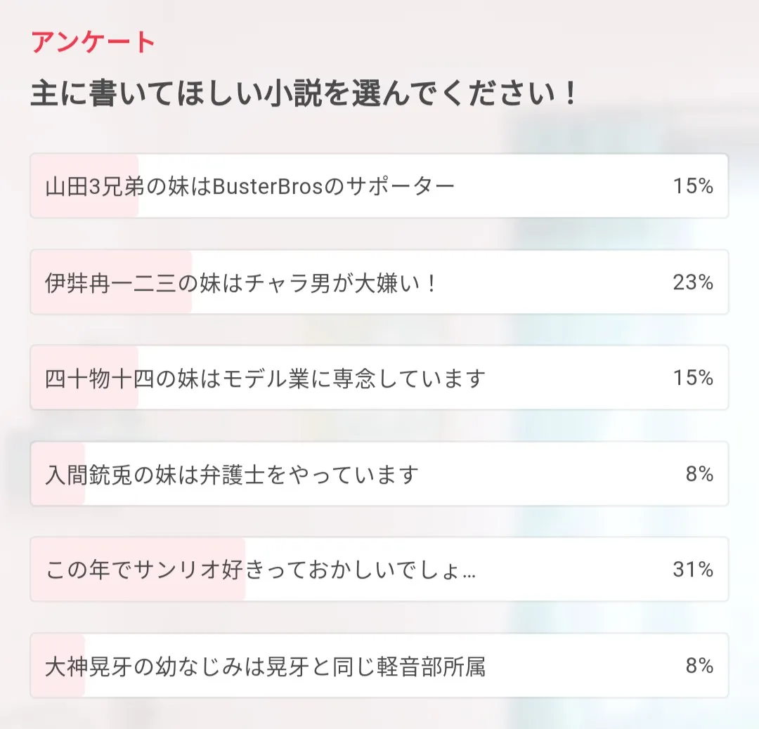 「この年でサンリオ好きっておかしいでしょ…」と「伊弉冉一二三の妹はチャラ男が大嫌い!」と「八乙女楽の妹は夢ノ咲に通ってます」に決定しました〜!