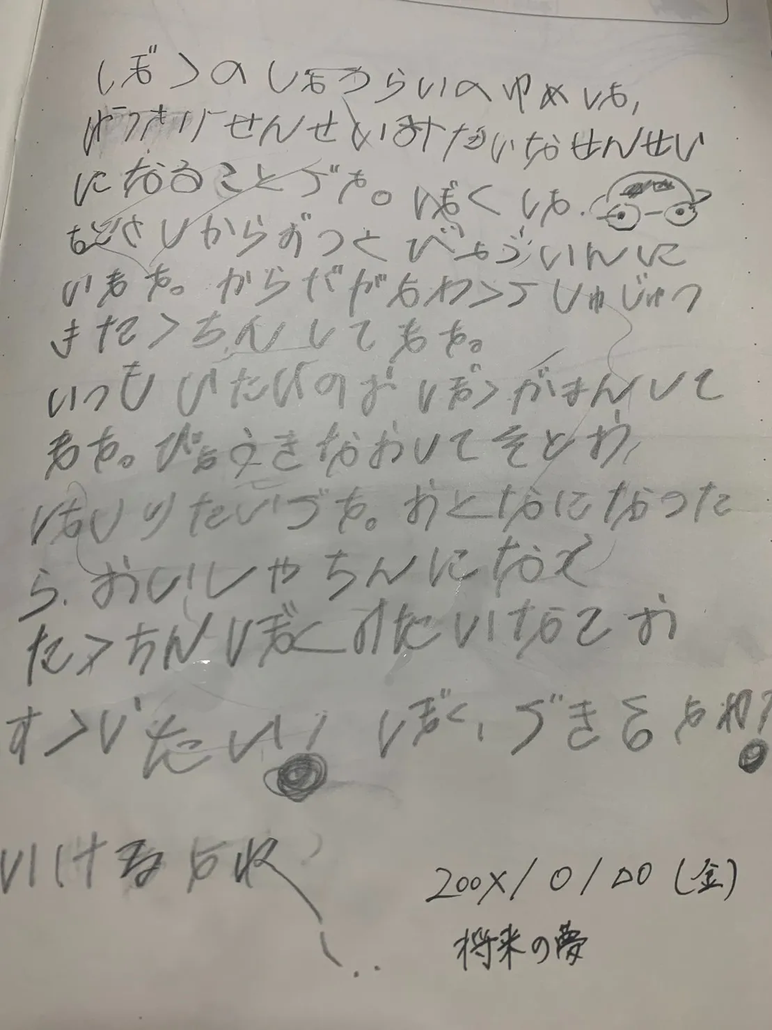 ここまで読んでくれてありがとう!久々ですね。。すいません。1番の最初の日記ていうの?文、めっちゃ書くの時間掛かったんだよねー。子供っぽさを感じさせるためにシャーペンじゃなくて鉛筆を使ったり、持ち方を変えてみたり、ネットで調べて子供の字の特徴を真似してみたり頑張ったぁぁ。文章は頑張って4、5歳ぐらいの心に戻って解読してほしいんだけど、、AIが解読したら、