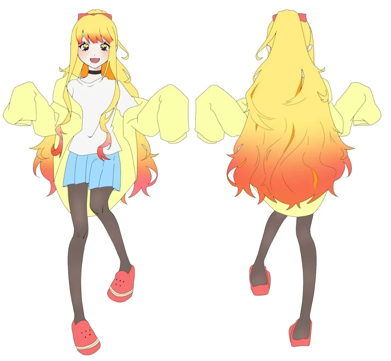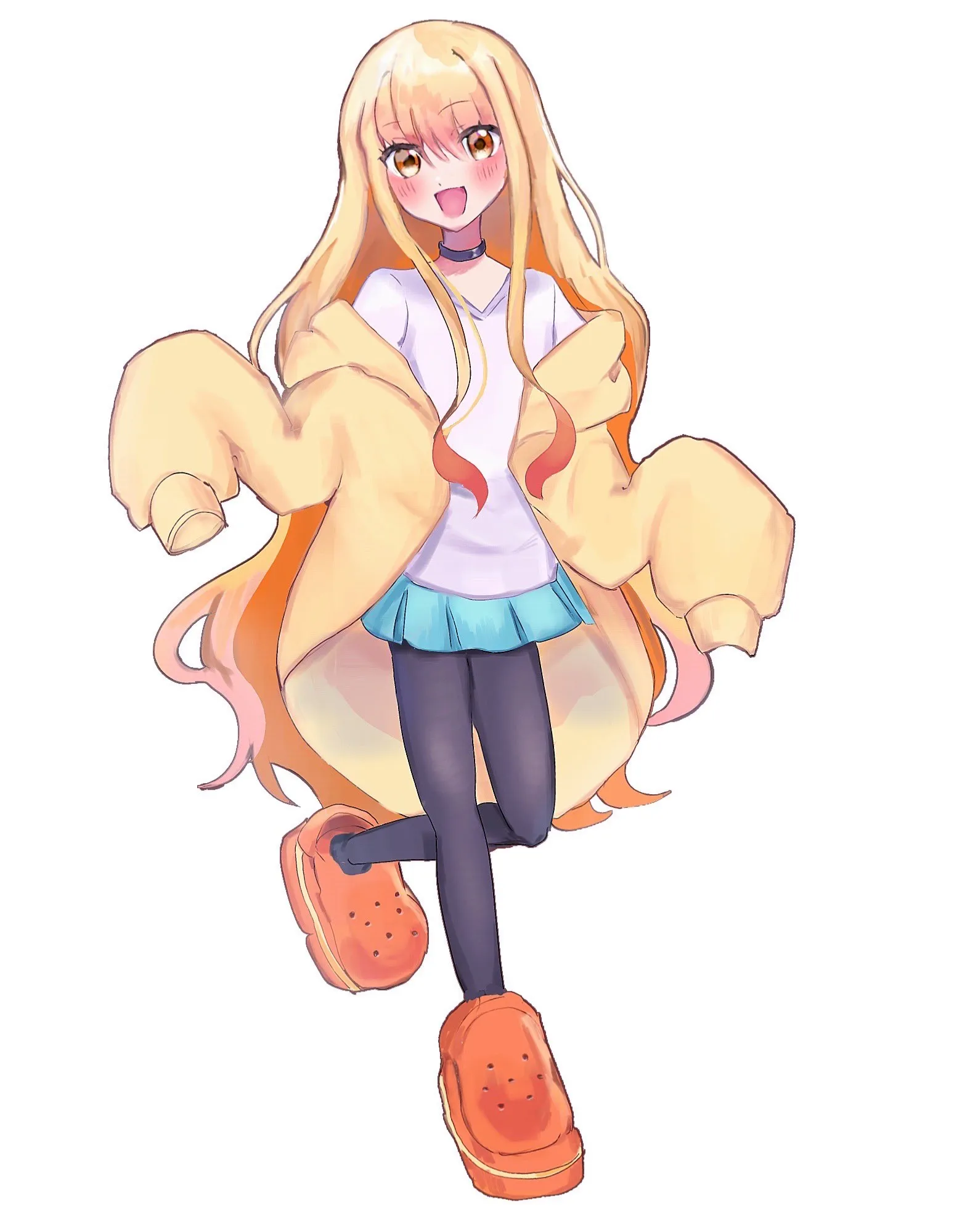 黒チョーカー 、 スカートは水色 ( タイツ履いてるから短め ) 、 シャツは白 ‼️