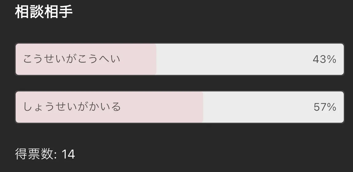 前回の話の最後にアンケートしたら、しょうせいがかいるに相談する方が多かったのでこっちにします。