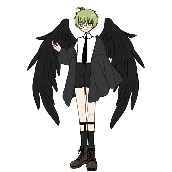 えっと、俺は全体的に黒で緑髪に黄色の目でして、