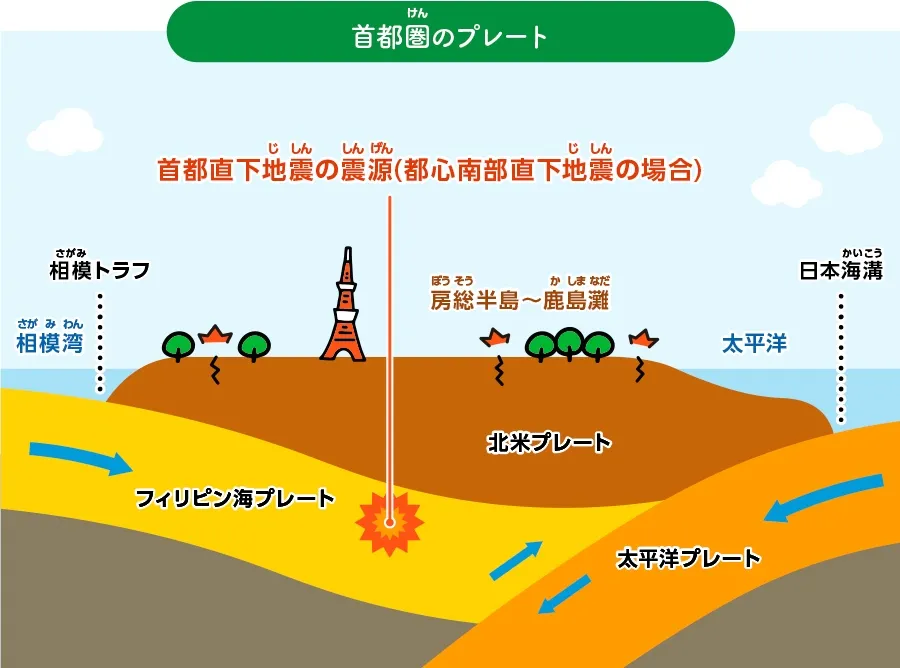 地震は、地球の表面を覆う「プレート」という巨大な岩盤が、年間数cmずつ移動しぶつかり合うことで発生します。プレート同士が押し合ってひずみが限界に達すると、岩盤がずれたり壊れたりして、その衝撃で大地が揺れる現象です。日本では、複数のプレートがひしめき合うため、地震が多く発生します。
