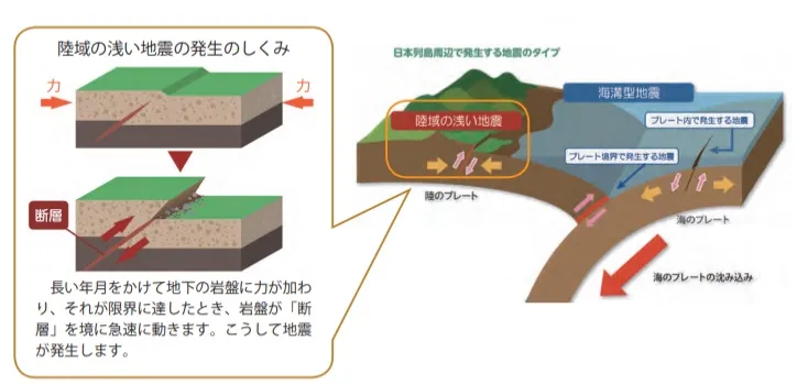 直下型地震とは、都市の直下(内陸部)の浅い活断層で発生し、規模の割に大きな揺れ(震度)と局所的な大被害をもたらす地震で、阪神・淡路大震災などが代表例です。海溝型と異なり、震源が近いため揺れが早く、緊急地震速報が間に合わないこともあり、建物倒壊やライフライン被害につながりやすいのが特徴です。
