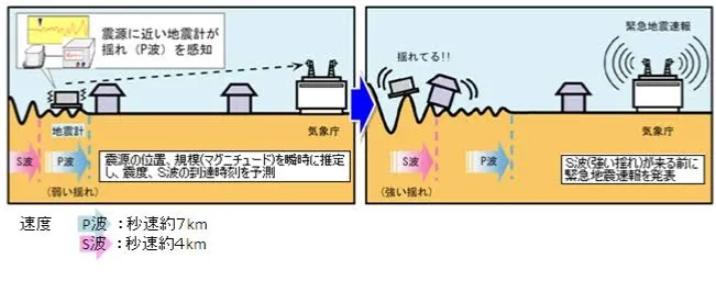 この地震波と電気信号が伝わる速度の差を利用すれば、地震が発生した場所の近くの地震計で地震波を検知し、それを電気信号で気象庁に伝え、地震波が伝わってくる前にこれから揺れることを再び電気信号を使って伝えることができます。