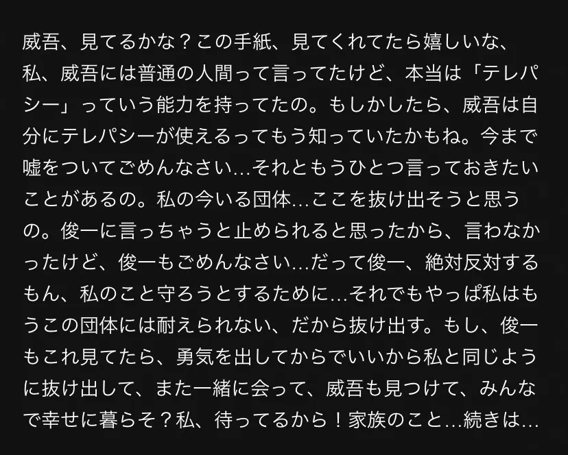 ………これ、もし俊一に見られてたら、私の運命は終わりかもね…でも私は、先にこの文章を威吾が見てると希望にかける!よく文章を見てね威吾。実は前のページに書いてた手紙、無理やり俊一に書かされたの。じゃないと「威吾をすぐに殺しに行く」とか言うから…だから私は仕方なく書いたけど、これをもし俊一に先に見られてたら…私はもう…この世にはいないかもしれないわね…本題に戻すとして…俊一はあなたを利用して、"全世界人間"を滅ぼそうとしてる。私がもし殺されていたら、俊一…いや、そいつにとっては思い通りなのかもしれない…なぜなら、自分の計画をばらすやつがいなくなるから…