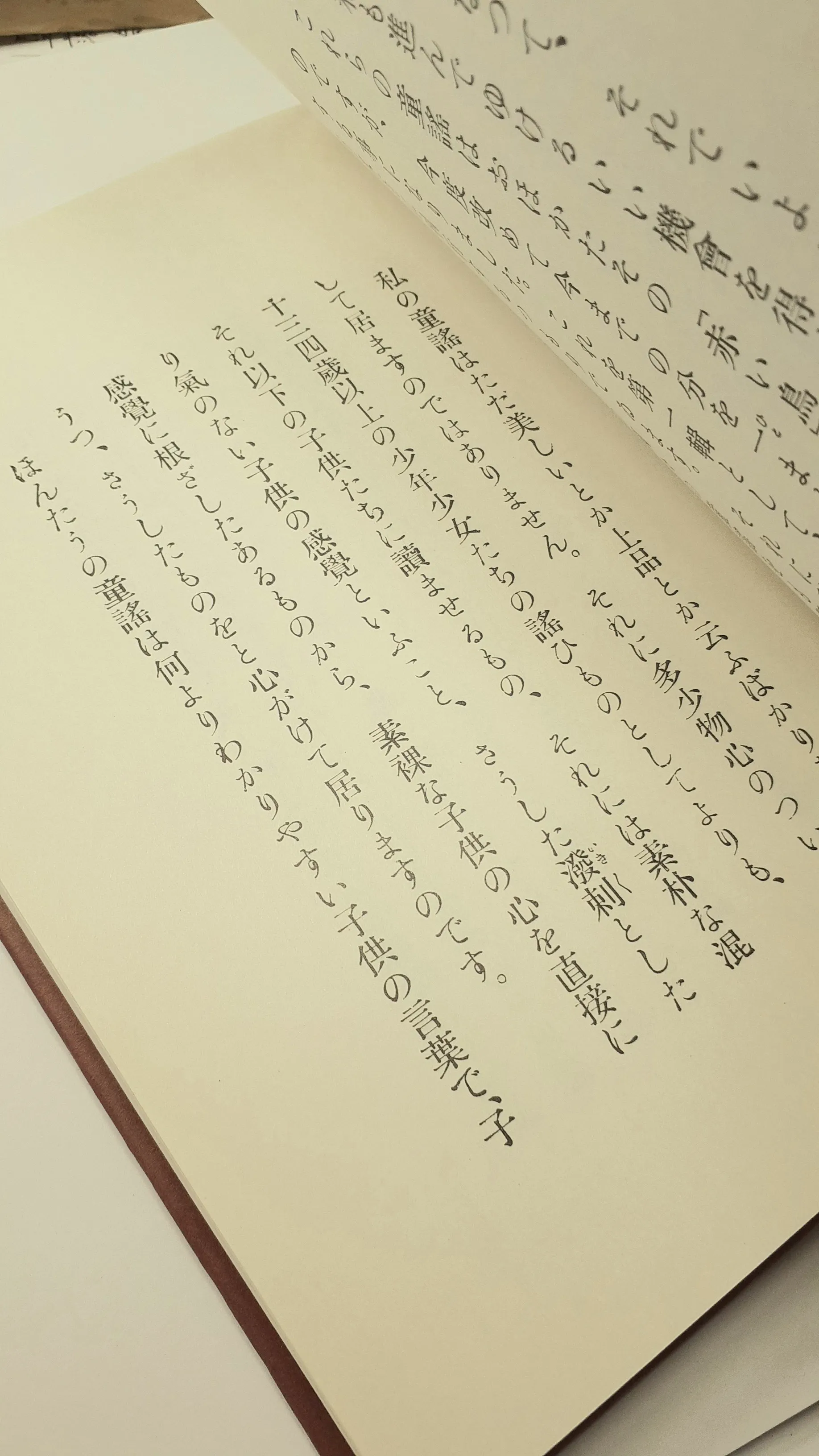 私の童謡はただ美しいとか上品とか云ふものを主にして居ますのではありません。それに多少物心のついた十三四歳以上の少年少女たちの謠ひものとしてよりも、それ以下の子供たちに讀ませるもの、それには素朴な混じり氣のない子供の感覺といふこと、さうした溌剌とした感覺に根ざしたあるものから、素裸な子供の心を直接にうつ、さうしたものをと心がけて居りますのです。