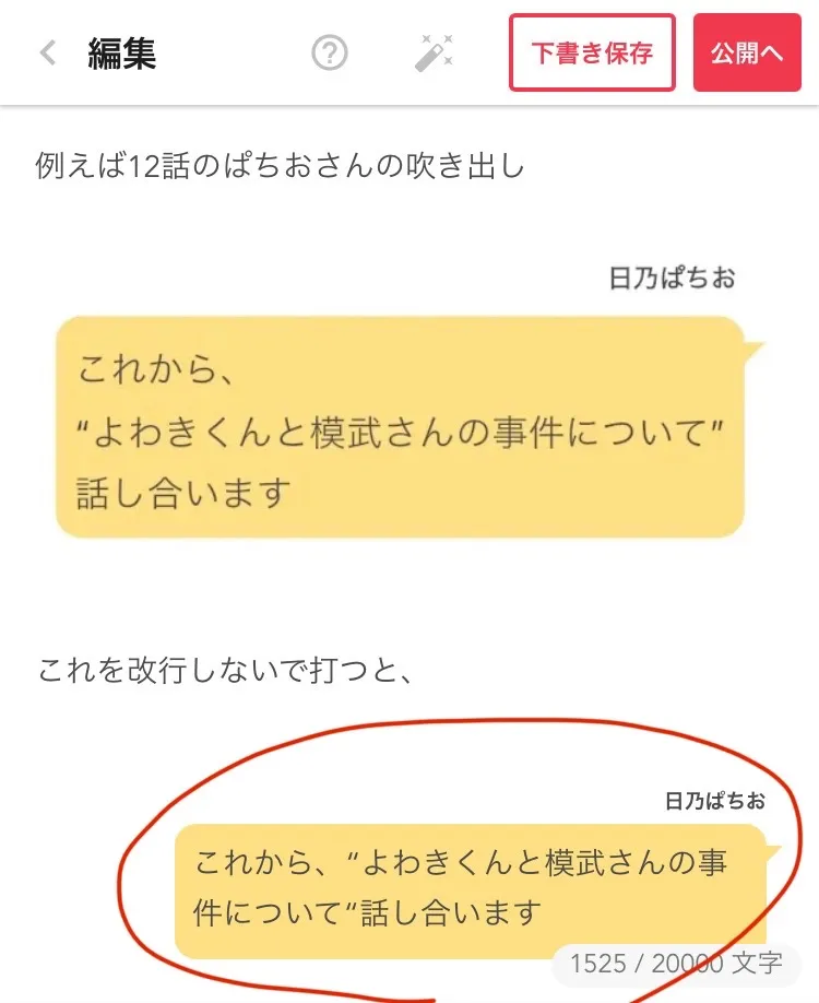 これは小説を書き始めて結構経った時に気づいたんですけど、吹き出しの中って編集画面と公開した後だと違うんですね!
