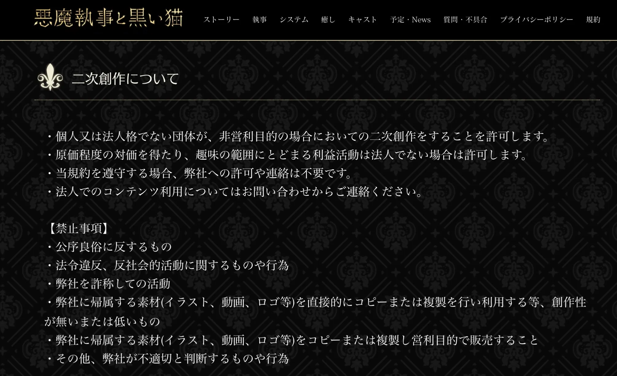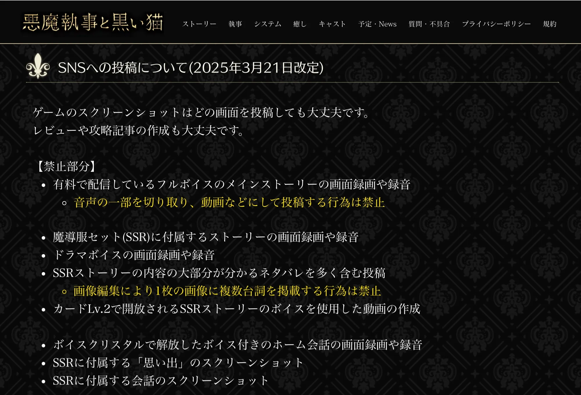 こちらは「悪魔執事と黒い猫」の二次創作、sns投稿における禁止事項について、スクショしたものになります