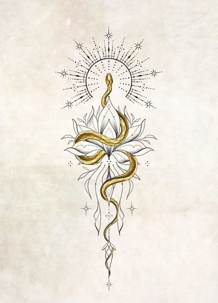 背中に蛇と蓮のタトゥー